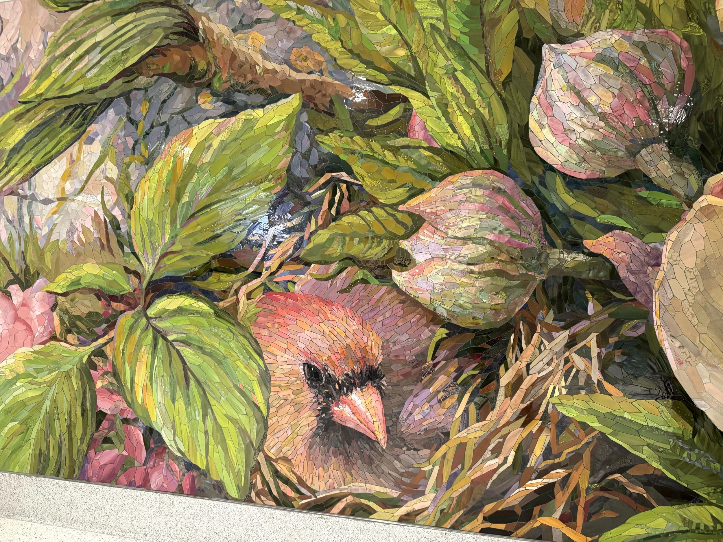 Carolina Canopy welcomes travelers to CLT Airport in the International Arrivals Hall, offering a first impression for international visitors and a warm “welcome home” for returning residents. This 8'3" high by 80' long hand-glazed, hand-cut mosaic mural serves as a gentle transition from the sky they’ve journeyed through to the grounding presence of Charlotte, just beyond the airport doors. Inspired by the region’s vibrant spring bloom, Carolina Canopy invites travelers into a treetop world—immersing them in the canopy of local flowering trees, where native and migratory birds perch among the branches in moments of stillness and discovery.