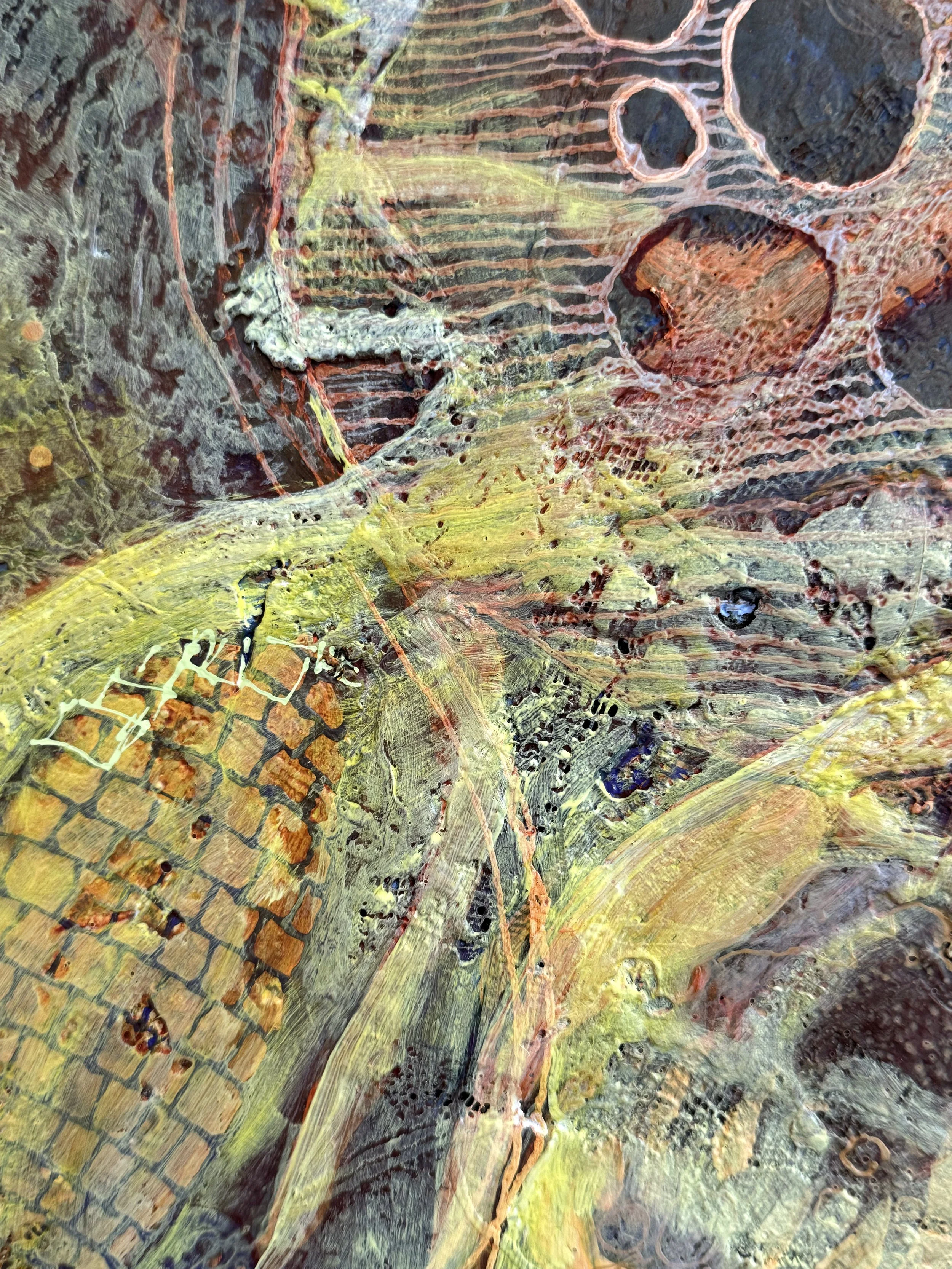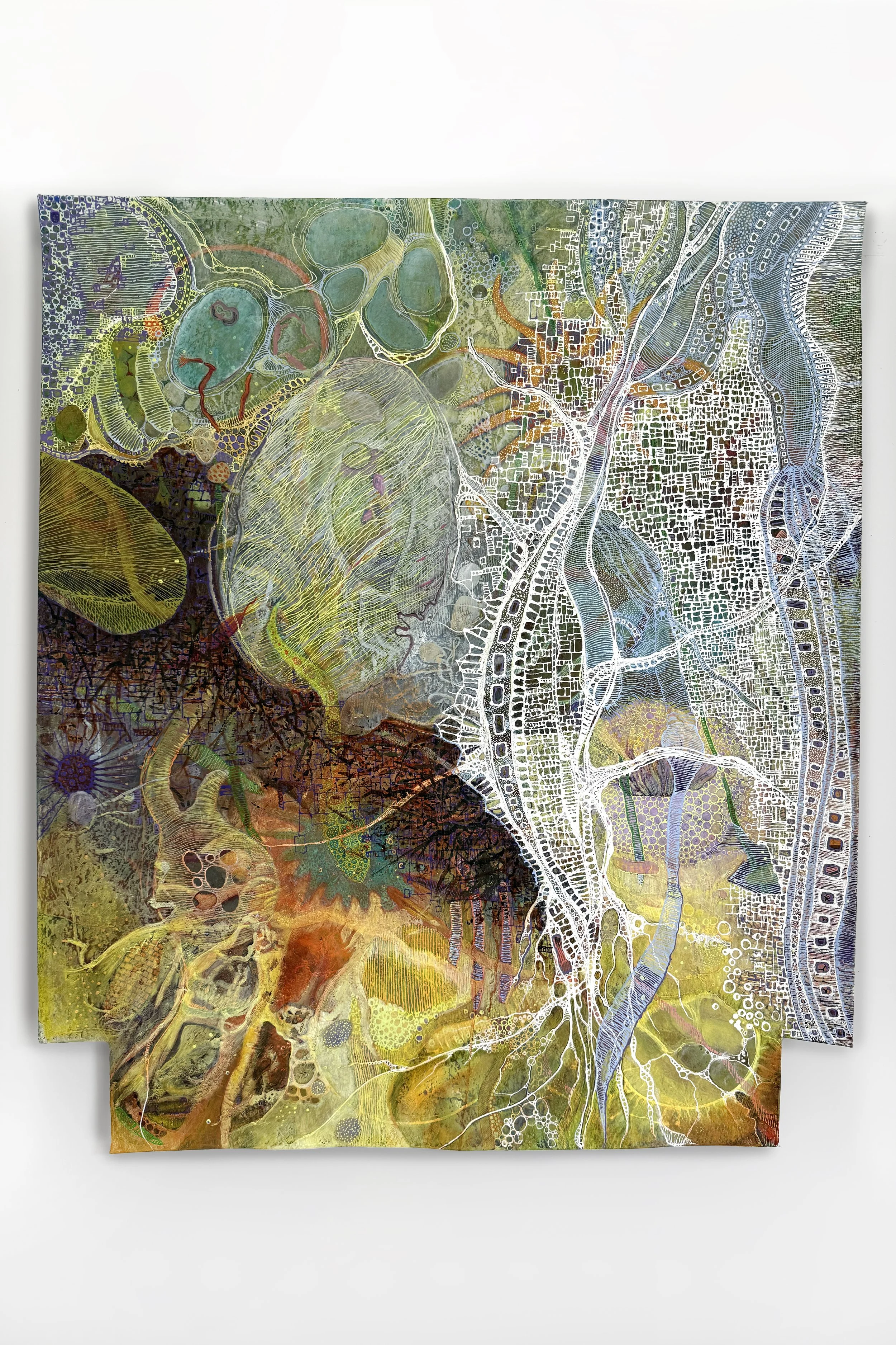 This work is a part of a larger ongoing series, Molting Mutations. This series features mixed media works constructed from repurposed materials, including old canvases, drop cloths, sculptures, drawings, and prints. These elements are layered, cut, and reassembled into textured, irregular forms that resemble tapestries. Through this process, a dialogue emerges between past and present, between what was once discarded and what becomes new.