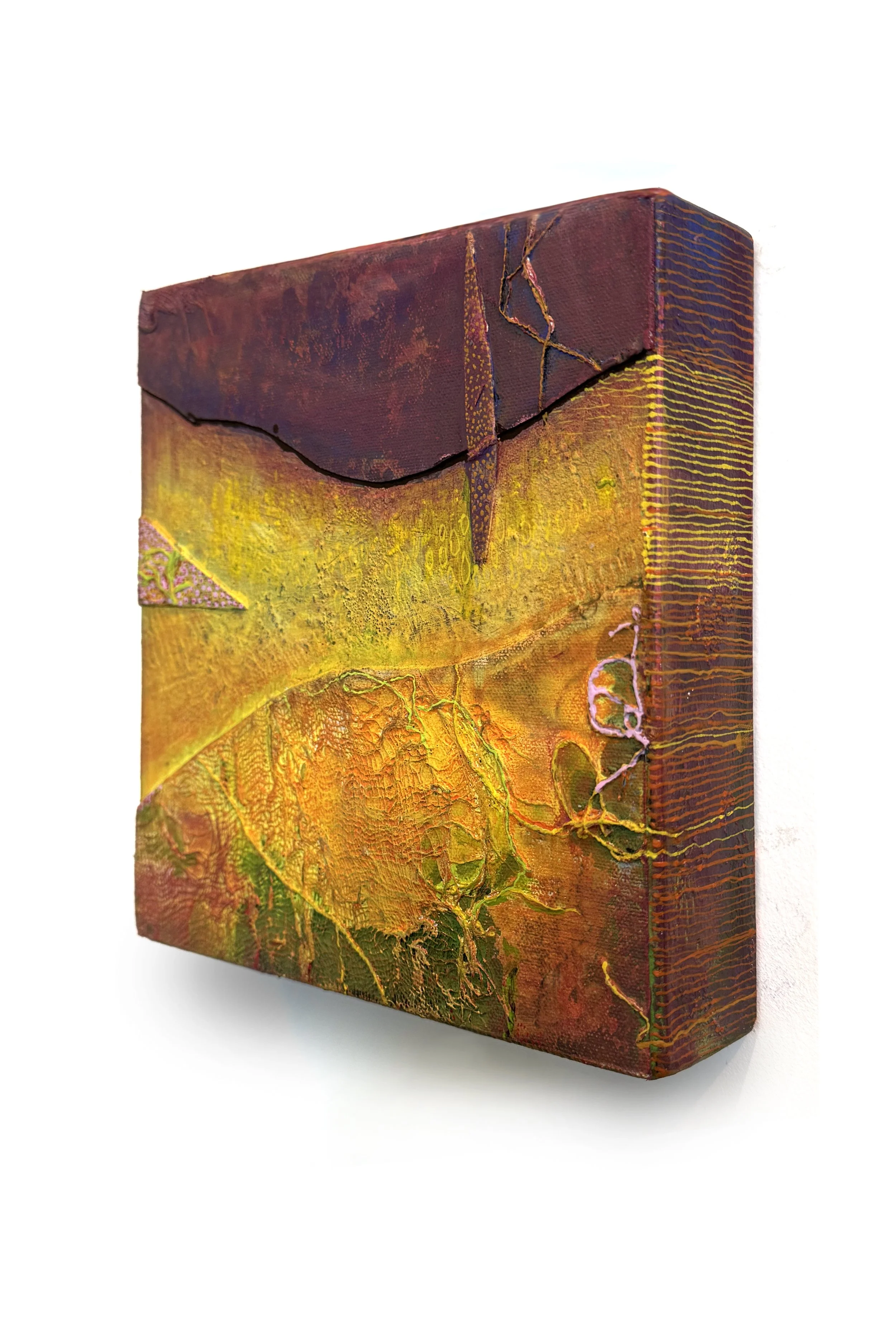 I construct paintings as terrains, using old canvas, tarps, and recycled fabric to create surfaces that direct the flow of paint. Layers of detailed painting, drawing, sanding, and incision record erosion, decay, rupture, saturation and collapse.